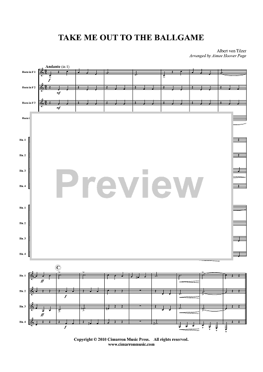 Digital Sheet Music for Take Me Out to the Ballgame - Score by Albert von Tilzer, Aimee Hoover Page scored for Horn Quartet; id:426875