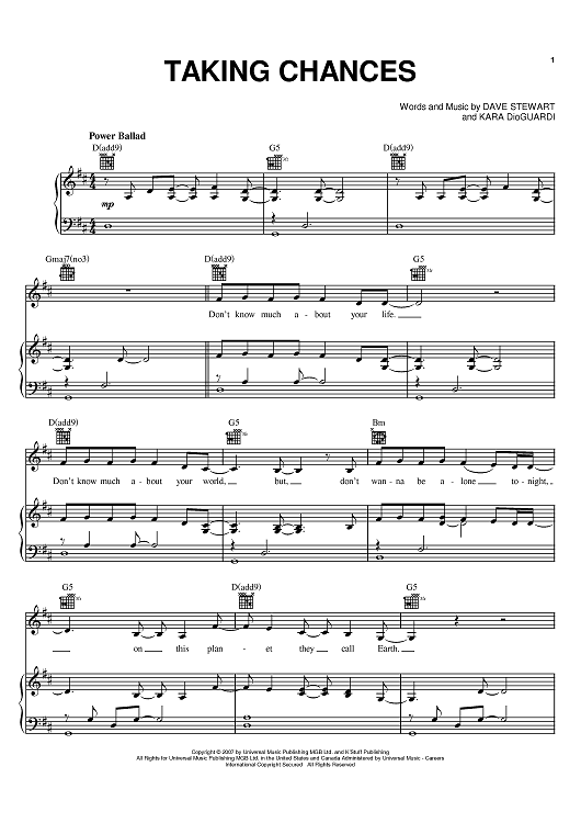 Digital Sheet Music for Taking Chances by Celine Dion, Dave Stewart, Kara DioGuardi scored for Piano/Vocal/Chords; id:402709