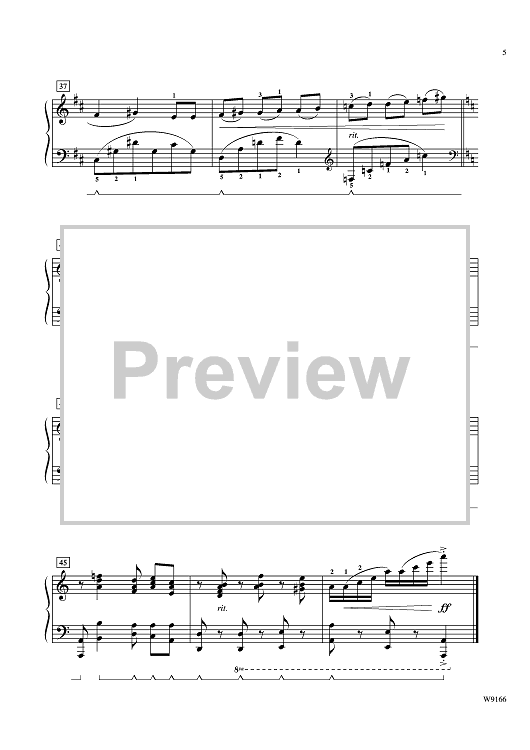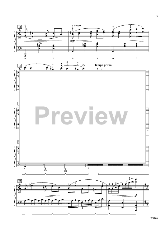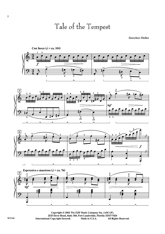 Dynamic, yet romantic, Tale of the Tempest contains both right-hand and left-hand melody, legato pedaling, changing keys and chord inversions. This superb solo, which also features syncopation, parallel 3rds, and octaves, will make a great recital piece.