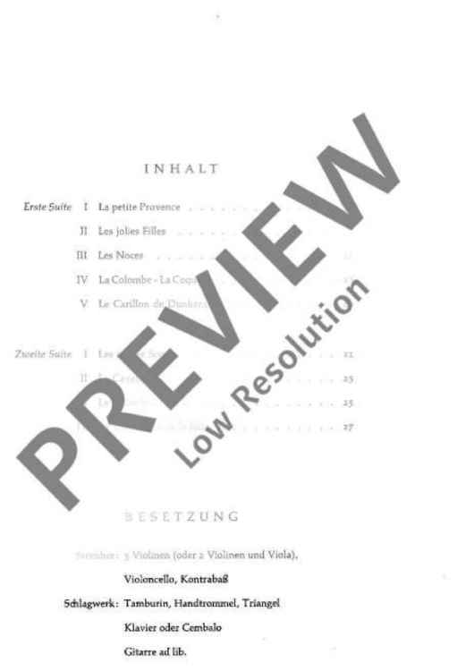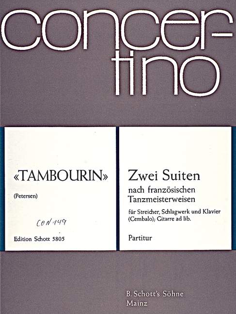 This edition contains vigorous dance tunes with illustrative titles such as „Les Noces“, „La Coquette“ or „Le Tambourin de la folie“. With -simple technique, they have been made into four- or five-movement suites with alternative scoring (strings soloistic or choric). To the guitar part (ad lib.) written out in full, chord letters have been added. Small percussion instru-ments (tambourine, hand drum and triangle) should not be missing.