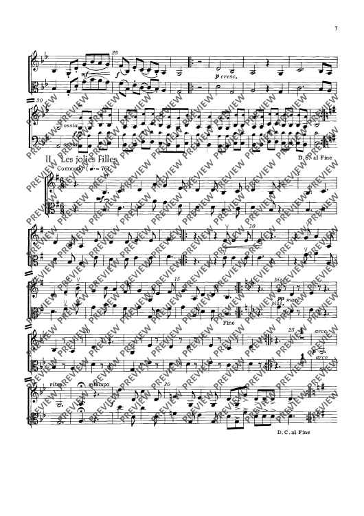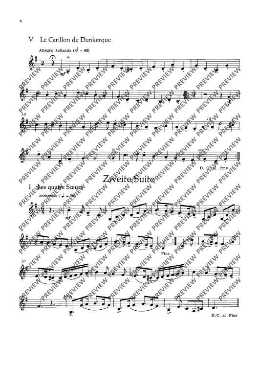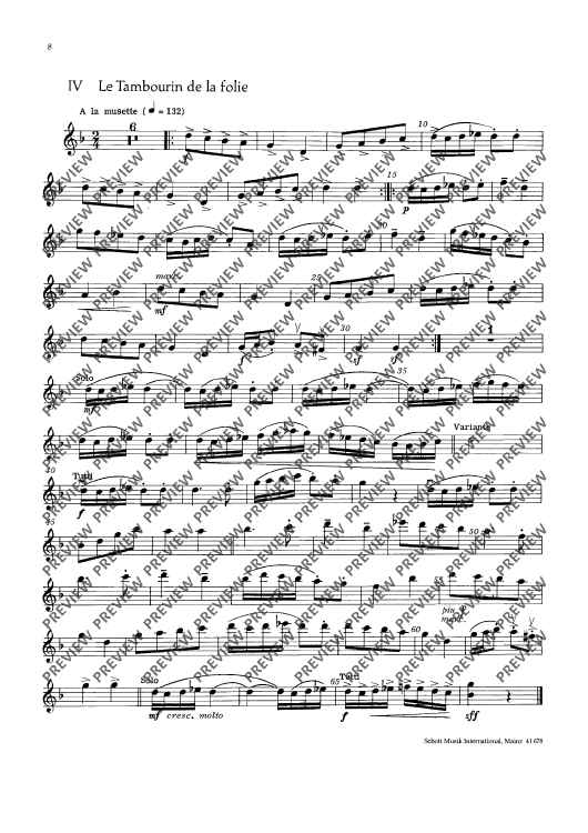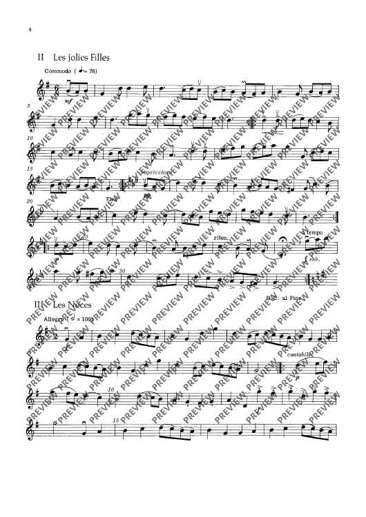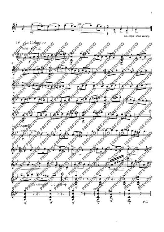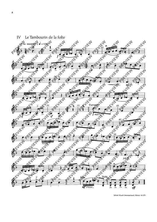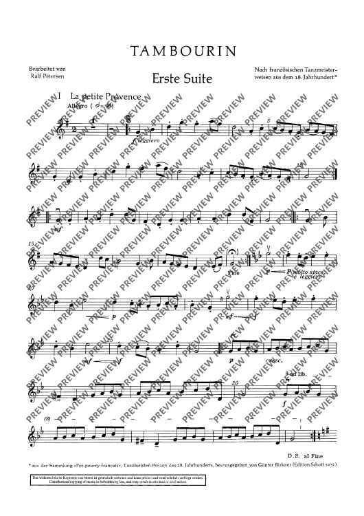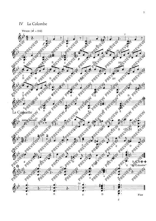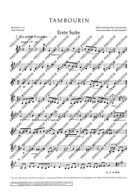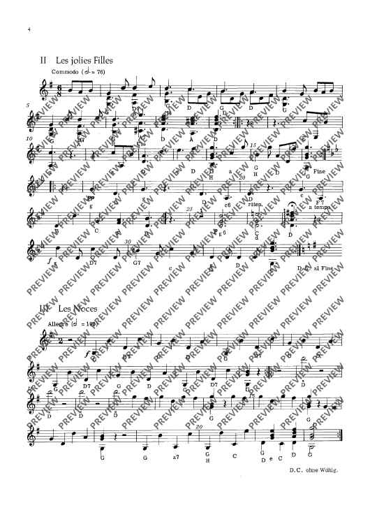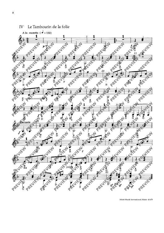 This edition contains vigorous dance tunes with illustrative titles such as „Les Noces“, „La Coquette“ or „Le Tambourin de la folie“. With -simple technique, they have been made into four- or five-movement suites with alternative scoring (strings soloistic or choric). To the guitar part (ad lib.) written out in full, chord letters have been added. Small percussion instru-ments (tambourine, hand drum and triangle) should not be missing.