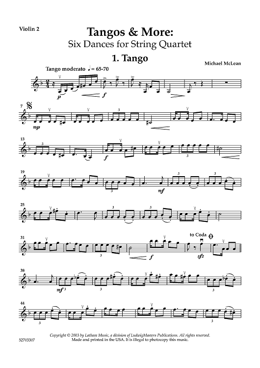 "Tangos & More: Six Dances for String Quartet - Violin 2" Sheet Music by Michael McLean