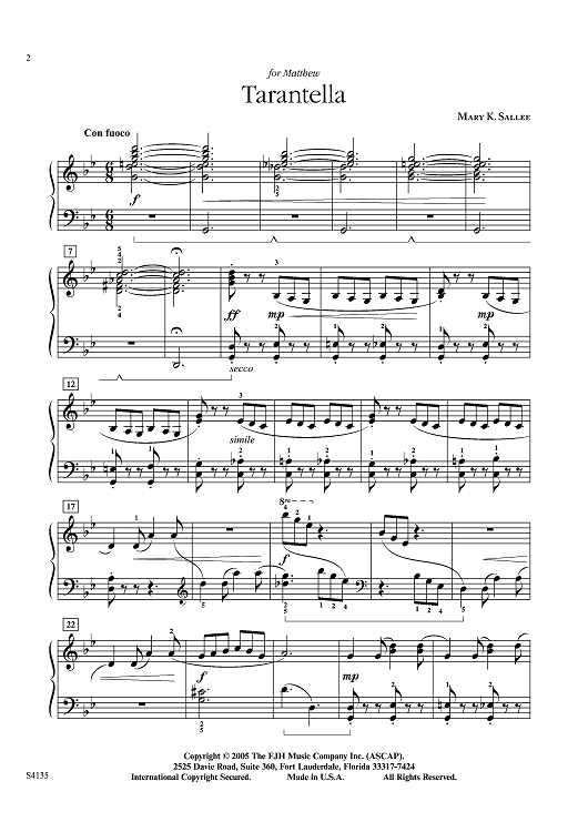 A lively traditional Italian dance piece written in 6/8 time that fits well under the hands. This Mary Sallee piece features a wide range of dynamics. Your students will love it.