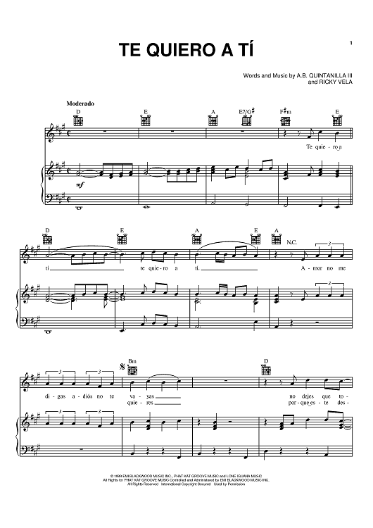 Digital Sheet Music for Te Quiero A Ti by A.B. Quintanilla III, Ricky Vela scored for Piano/Vocal/Chords; id:371772