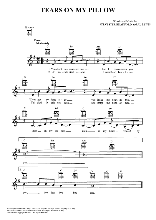 Digital Sheet Music for Tears on My Pillow by Al Lewis, Sylvestor Bradford, Little Anthony & The Imperials scored for Ukulele/Vocal; id:447649