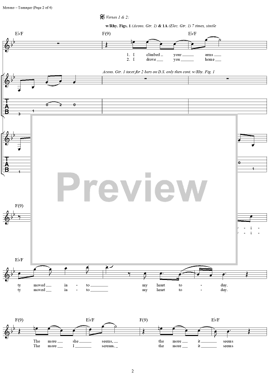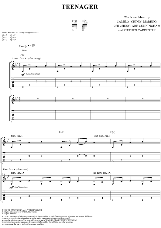 Digital Sheet Music for Teenager by Deftones, Chino Moreno, Chi Cheng, Abe Cunningham scored for Guitar Tab/Vocal; id:286533