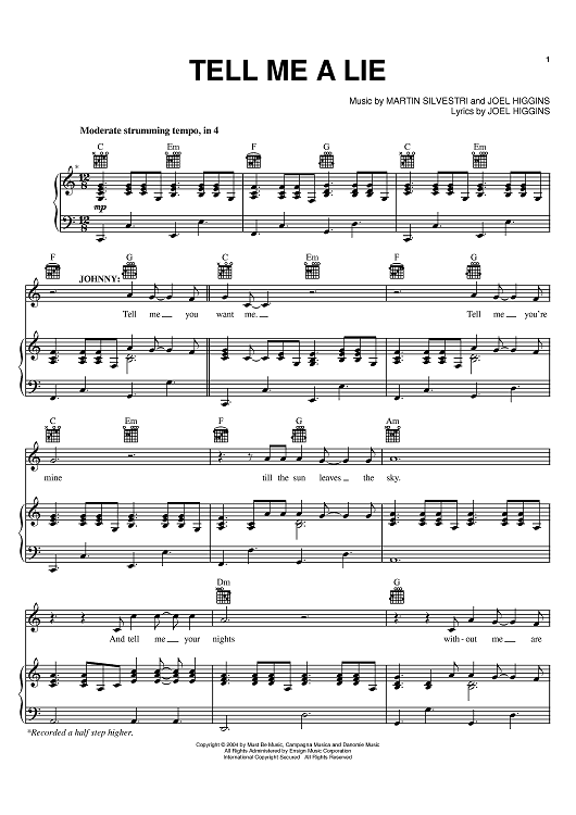 Digital Sheet Music for Tell Me A Lie by Joel Higgins, Martin Silvestri scored for Piano/Vocal/Chords; id:386493