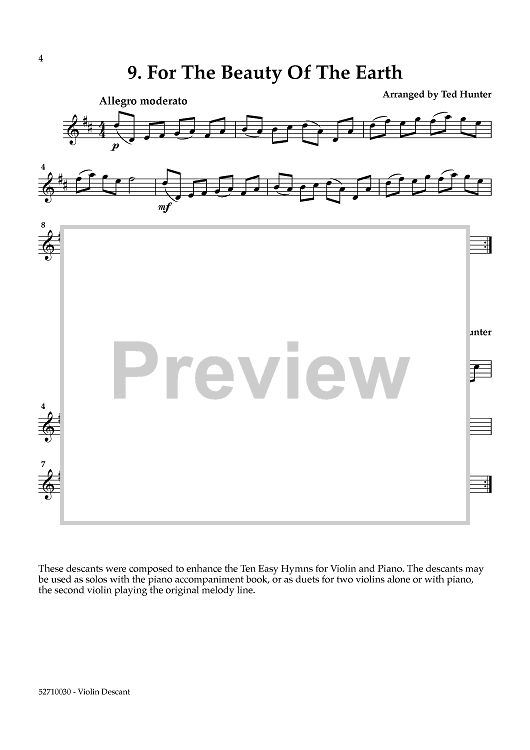 Written so that the violinist never needs to leave first position, this volume is perfect for the beginning player or the more experienced musician looking for selections that are quick to prepare. It is made all the more flexible by the addition of optional advanced descant parts.