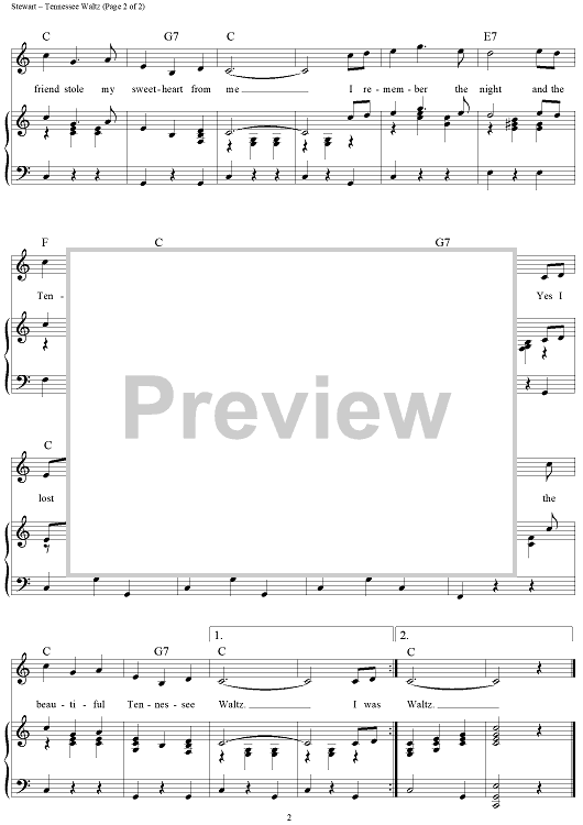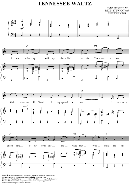 Digital Sheet Music for Tennessee Waltz by Redd Stewart, Pee Wee King, Patti Page scored for Piano/Vocal/Chords; id:95609