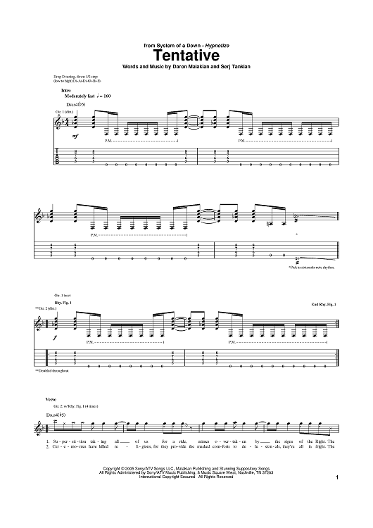 Digital Sheet Music for Tentative by Daron Malakian, System Of A Down, Serj Tankian scored for Guitar Tab; id:389430