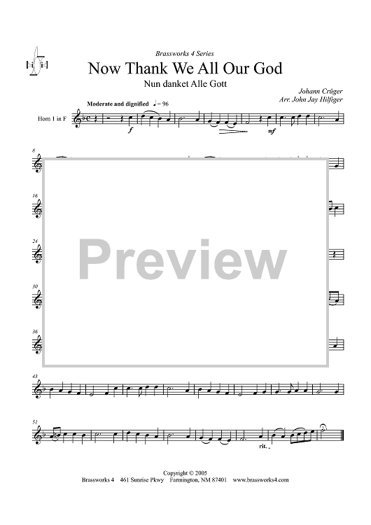 Digital Sheet Music for Thank We All Our God (Nun danket Alle Gott) - Horn 1 in F by Johann Crüger, John Jay Hilfiger scored for Horn Quartet; id:357960