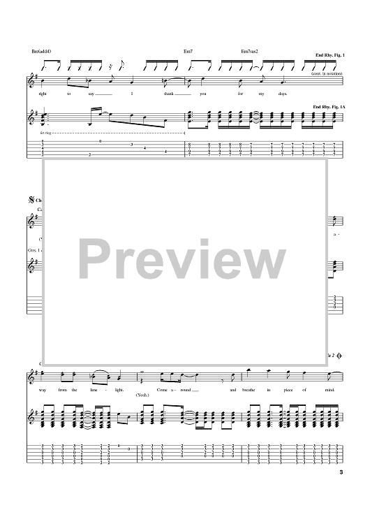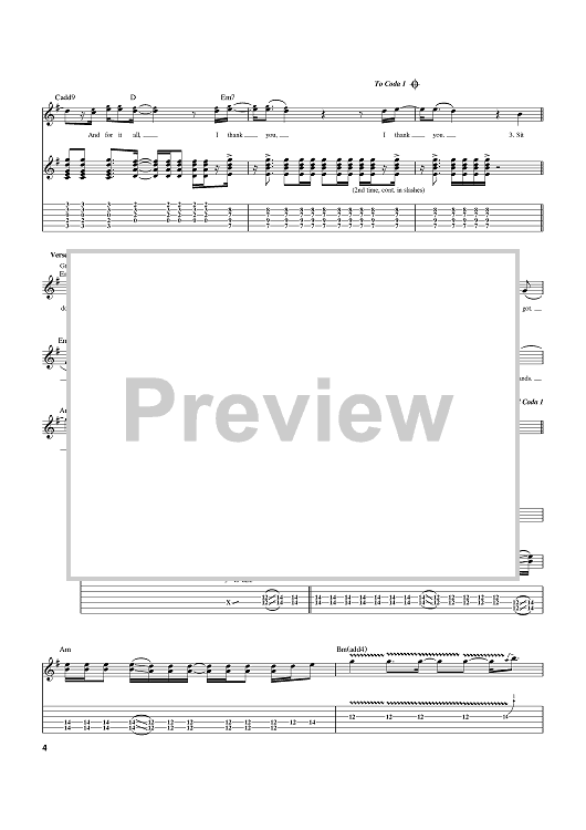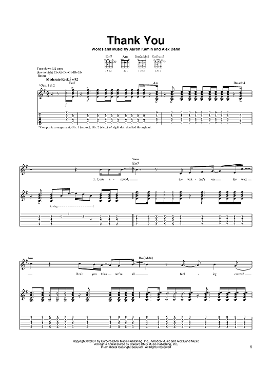 Digital Sheet Music for Thank You by Aaron Kamin, Alex Band, The Calling scored for Guitar Tab; id:369428