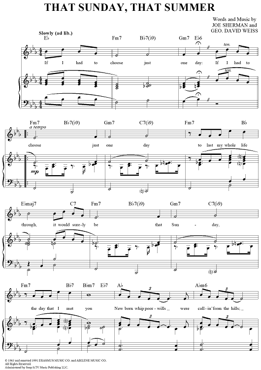 Digital Sheet Music for That Sunday, That Summer by Nat King Cole, George David Weiss, Joe Sherman scored for Piano/Vocal/Chords; id:360914