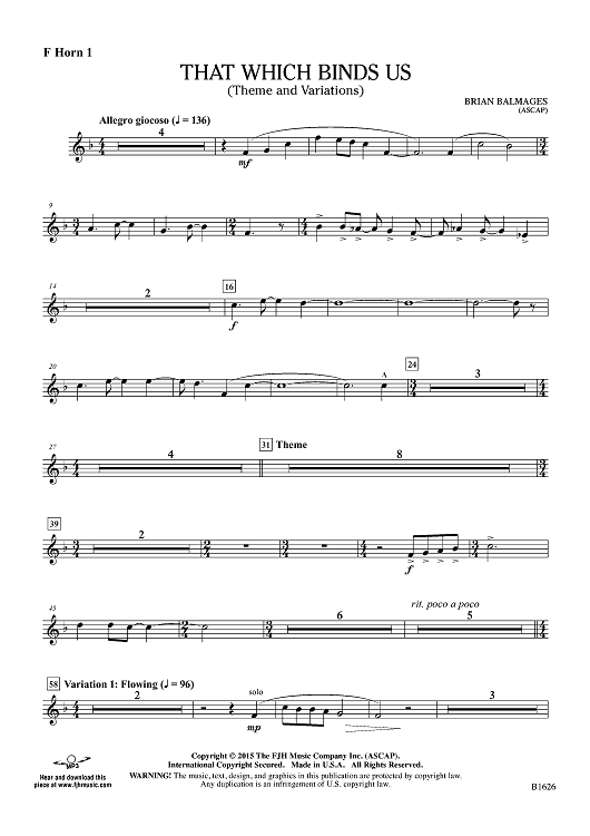 "That Which Binds Us (Theme and Variations) - F Horn 1" Sheet Music by Brian Balmages