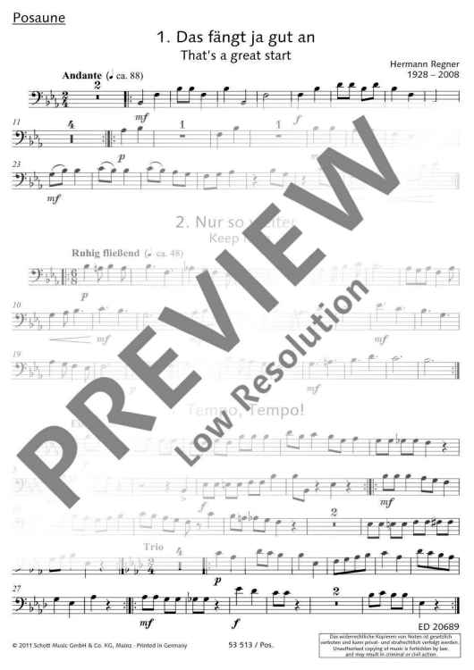 Apart from numerous publications in the field of music education, the music teacher and composer Hermann Regner (1928-2008) contributed considerably to the brass repertoire, such as material for wind orchestra and wind band. Influenced by his studies with Carl Orff, he paid special attention to the fusion of instrumental education and contemporary music. A matter of particular concern for him was to write practical, easily playable new music for children, young people and amateur musicians - music that takes the technical competence of beginners into account and motivates them to concern themselves with new sounds, rhythms and playing techniques. 'All begins well' is a small collection of easy pieces for trombone with piano accompaniment. The five short pieces are a perfect addition to instrument lessons and 'Jugend musiziert'. The pieces are very melodic, using simple keys (F major, B flat major, E flat major) which are easy to play by the trombone, and they cover a compass from B flat to E flat1.