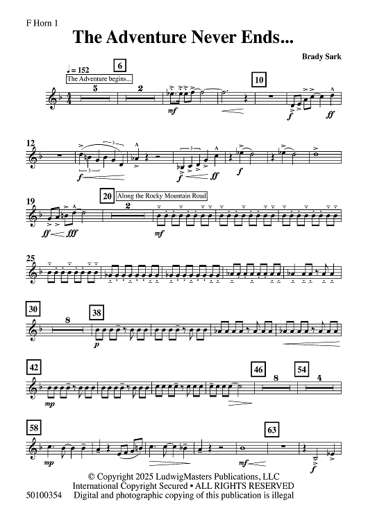Digital Sheet Music for The Adventure Never Ends - F Horn 1 by Brady Sark scored for Concert Band; id:506977