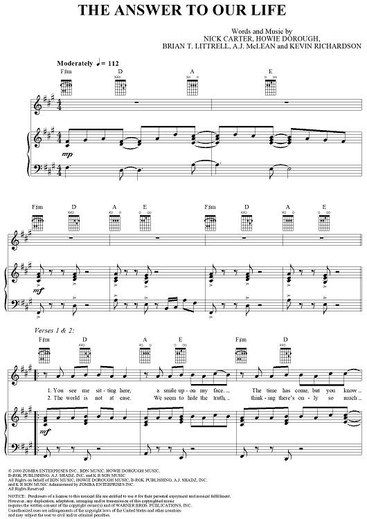 Digital Sheet Music for The Answer to Our Life by Kevin Scott Richardson, Backstreet Boys, Nick Carter, Howie Dorough, A. J. McLean, Brian Littrell scored for Piano/Vocal/Chords; id:284329