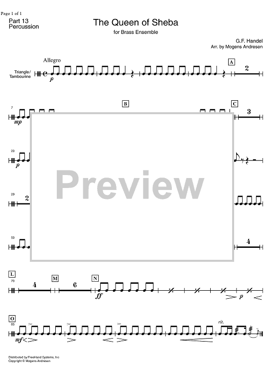 Digital Sheet Music for The Arrival of the Queen of Sheba HWV 67 - Percussion by George Frideric Handel, Mogens Andresen scored for Brass Ensemble; id:328294