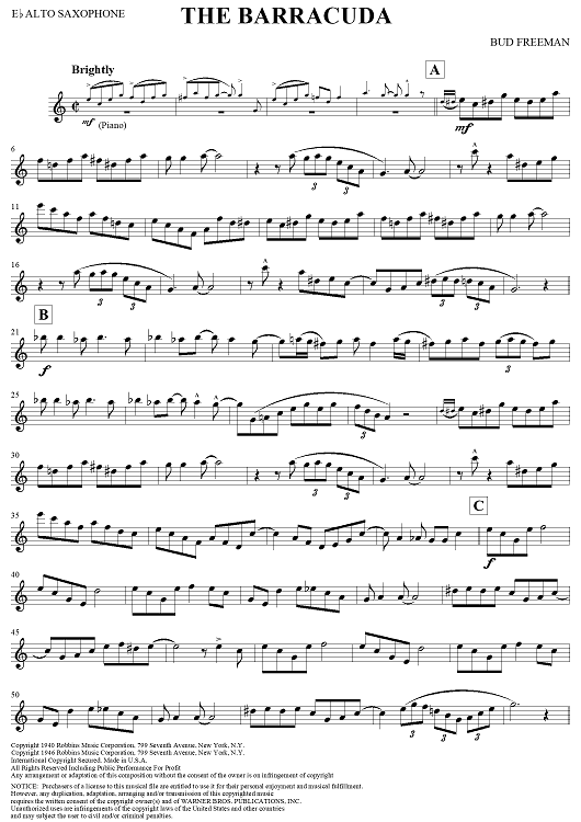 "The Barracuda - E-flat Alto Saxophone" Sheet Music by Bud Freeman