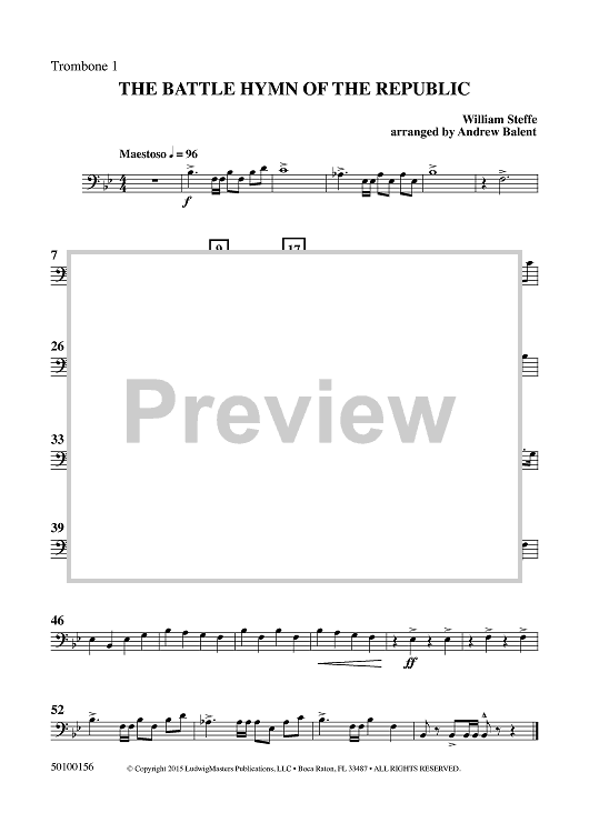 Digital Sheet Music for The Battle Hymn of the Republic - Trombone 1 by William Steffe, Andrew Balent scored for Concert Band; id:459697