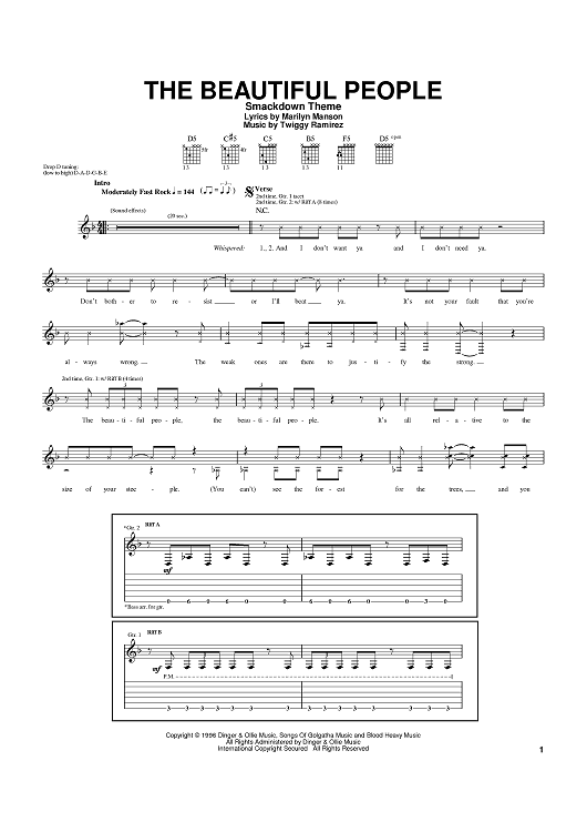 Digital Sheet Music for The Beautiful People by Marilyn Manson, Twiggy Ramirez scored for Guitar Tab; id:371237