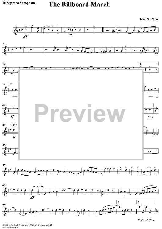 Digital Sheet Music for The Billboard March - Soprano Saxophone by John N. Klohr scored for Concert Band; id:282732