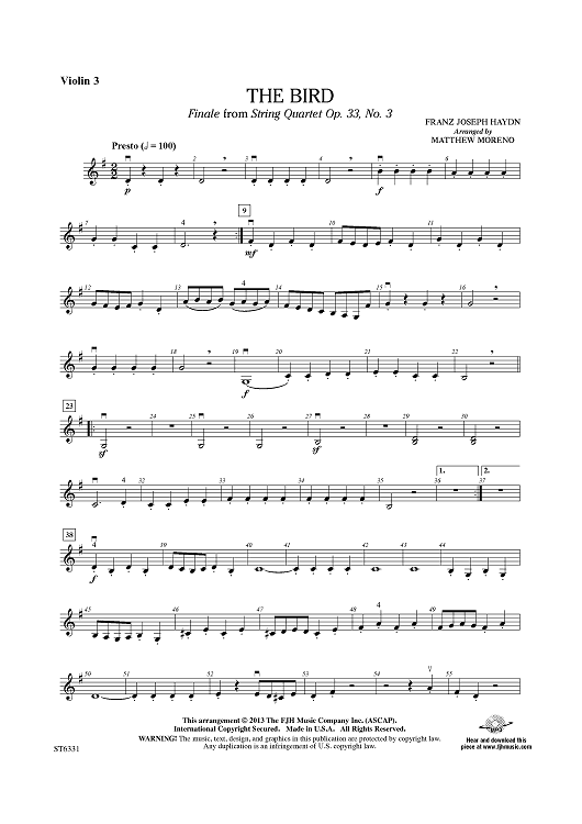 Digital Sheet Music for The Bird (Finale from String Quartet Op. 33 No. 3) - Violin 3 (Viola T.C.) by Franz Joseph Haydn, Matthew Moreno scored for String Orchestra; id:437159