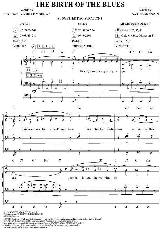 Digital Sheet Music for The Birth of the Blues by Ray Henderson, Lew Brown, Buddy DeSylva scored for Easy Organ/Vocal; id:267032