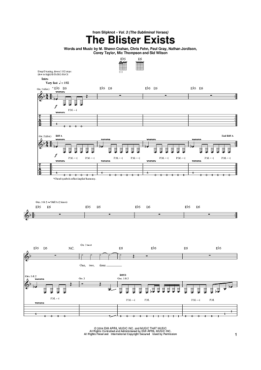 Digital Sheet Music for The Blister Exists by Shawn Crahan, Chris Fehn, Paul Gray, Joey Jordison, Slipknot, Corey Taylor, Mic Thompson, Sid Wilson scored for Guitar Tab; id:379158