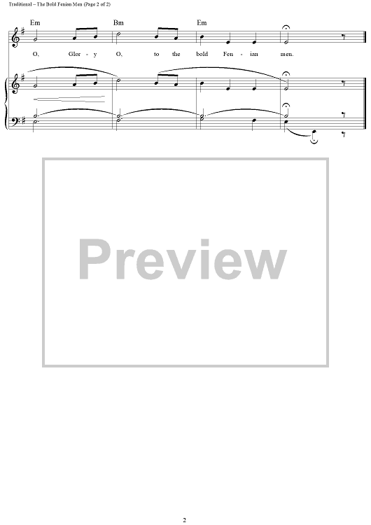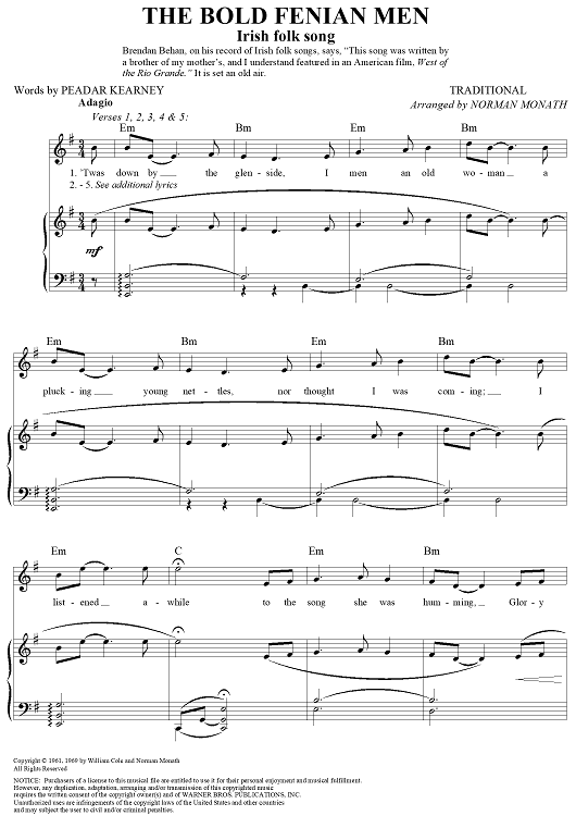 Digital Sheet Music for The Bold Fenian Men by Norman Monath, Peadar Kearney, Traditional scored for Piano/Vocal/Chords; id:260593