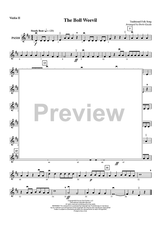 Digital Sheet Music for The Boll Weevil - Violin 2 by Traditional, Doris Gazda scored for String Orchestra; id:449917