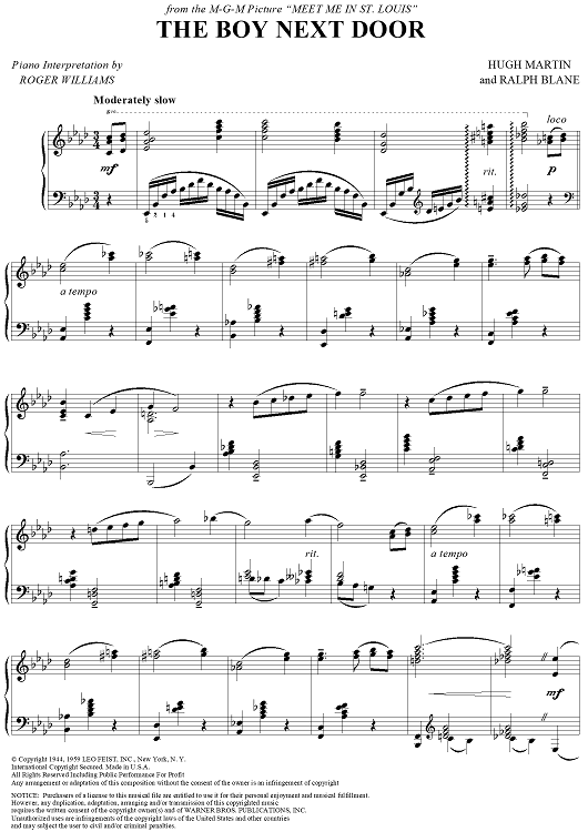Digital Sheet Music for The Boy Next Door by Hugh Martin, Roger Williams, Ralph Blane scored for Piano Solo; id:321613