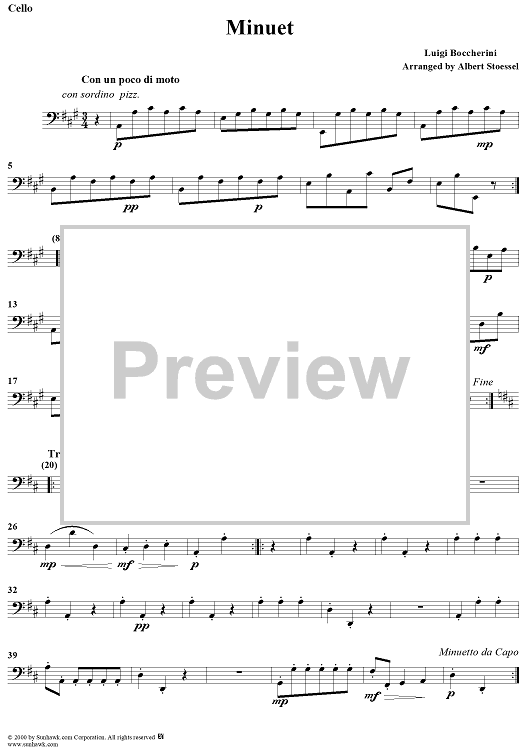 Digital Sheet Music for The Celebrated Minuet - Cello by Albert Stoessel, Luigi Boccherini scored for String Quartet; id:235706