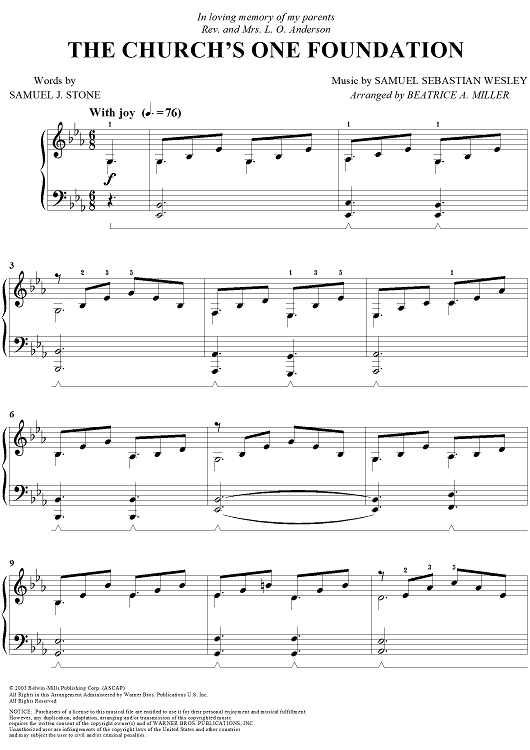 Digital Sheet Music for The Church's One Foundation by Beatrice A. Miller, Samuel Sebastian Wesley, Samuel John Stone scored for Easy Piano; id:294631