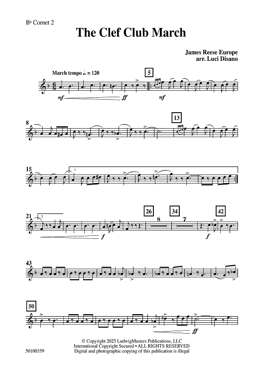 Digital Sheet Music for The Clef Club March - Bb Cornet 2 by James Reese Europe, Luci Disano scored for Concert Band; id:507085