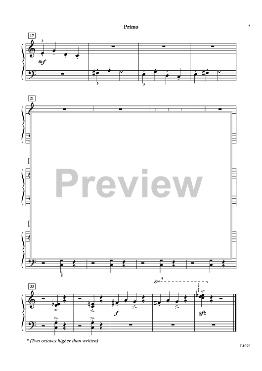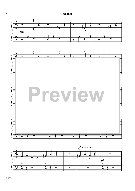 Written for one piano, four hands, this late elementary ensemble piece has very distinctive melodic and harmonic components that create interesting interplay between the primo and secondo parts. Delightfully unusual, this piece will provide students with a surprisingly unexpected-sounding duet piece!