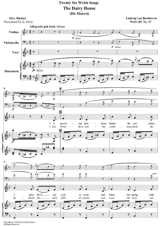 Digital Sheet Music for The Dairy House - from 26 Welsh Songs by Ludwig van Beethoven scored for STB Choir/Violin/Cello/Piano; id:468200