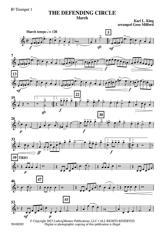 Digital Sheet Music for The Defending Circle - Bb Trumpet 1 by Gene Milford, Karl King scored for Concert Band; id:509209