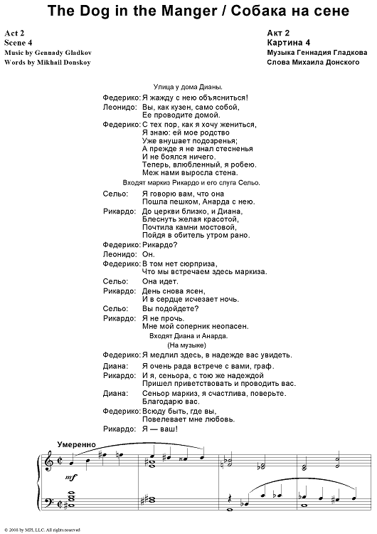 Digital Sheet Music for The Dog in the Manger. Act 2. Scene 4. Duet of Federico and Ricardo by , Gennady Gladkov, Mikhail Donskoy scored for Vocal Score; id:403453