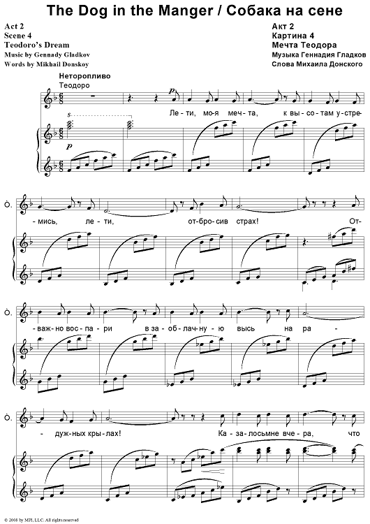 Digital Sheet Music for The Dog in the Manger. Act 2. Scene 4. Teodoro’s Dream by , Gennady Gladkov, Mikhail Donskoy scored for Vocal Score; id:403454
