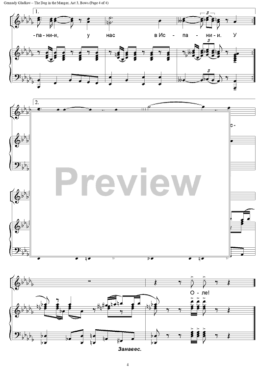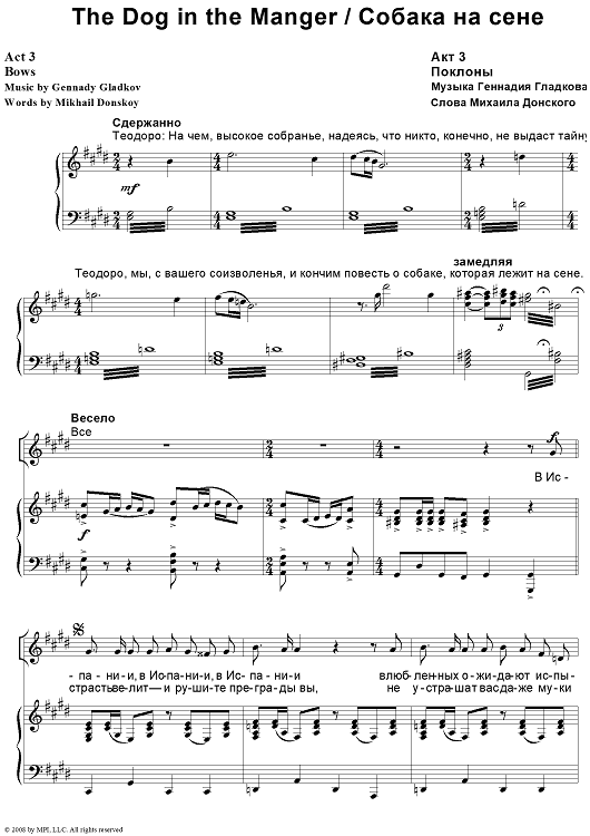 Digital Sheet Music for The Dog in the Manger. Act 3. Bows by , Gennady Gladkov, Mikhail Donskoy scored for Vocal Score; id:403475