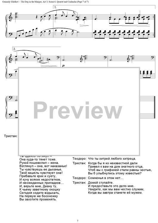 Digital Sheet Music for The Dog in the Manger. Act 3. Scene 6. Quartet and Cachucha by , Gennady Gladkov, Mikhail Donskoy scored for Vocal Score; id:403469