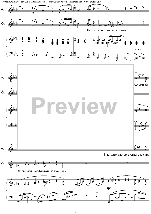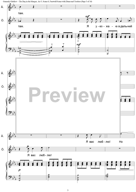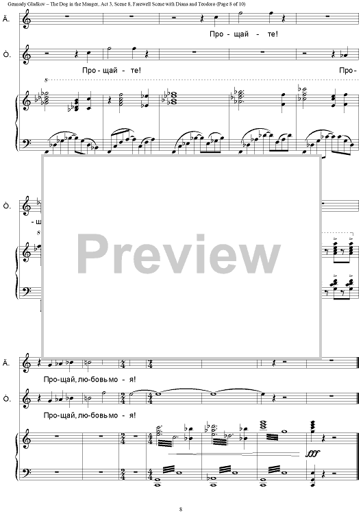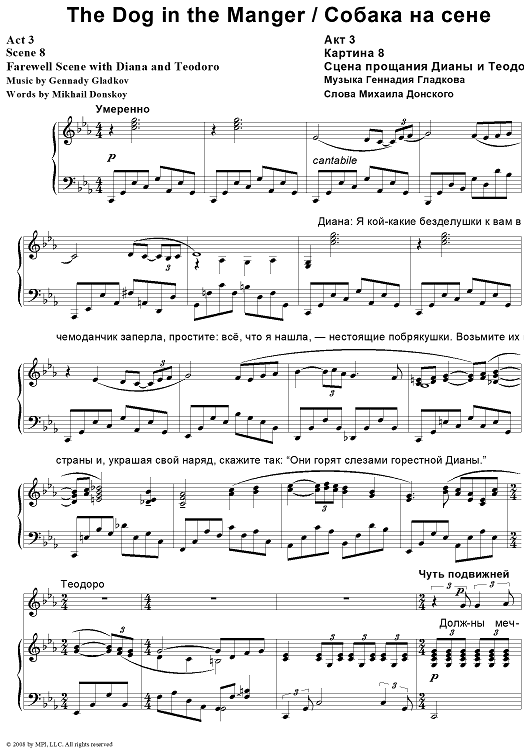 Digital Sheet Music for The Dog in the Manger. Act 3. Scene 8. Farewell Scene with Diana and Teodoro by , Gennady Gladkov, Mikhail Donskoy scored for Vocal Score; id:403472