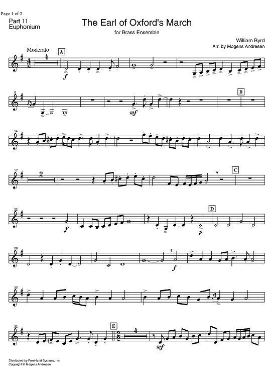 Digital Sheet Music for The Earl of Oxford's March - Euphonium by William Byrd, Mogens Andresen scored for Brass Ensemble; id:328249