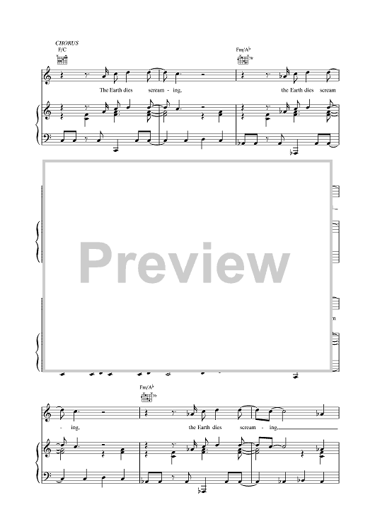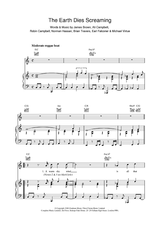 Digital Sheet Music for The Earth Dies Screaming by UB40, Michael White, Ali Campbell, Robin Campbell, Norman Hassan, Brian Travers, Earl Falconer, Jimmy Brown, Mickey Virtue scored for Piano/Vocal/Chords; id:379768