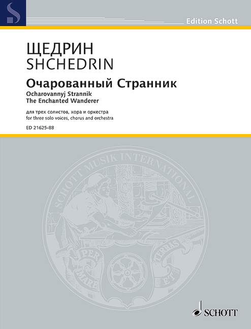 Shchedrin's concert opera 'The Enchanted Wanderer' has quickly taken a permanent place in the musical canon. Now the piano score of the successful and impressive work is being published. Deep Slavonic emotions and gripping virtuosity characterize both this piece and many other compositions by Shchedrin. Even if he has been a cosmopolitan for a long time, the Moscow-born composer nevertheless remains an originally Russian composer whose attachment to Russian music folklore and poetry has never been broken off. The text of this 'opera for the concert stage' is based on a legend by the great Russian narrator Nikolay S. Leskov and tells the story of an enchanted pilgrim. The dramatic action is told by three vocal soloists, large choir and orchestra in colourful musical pictures.