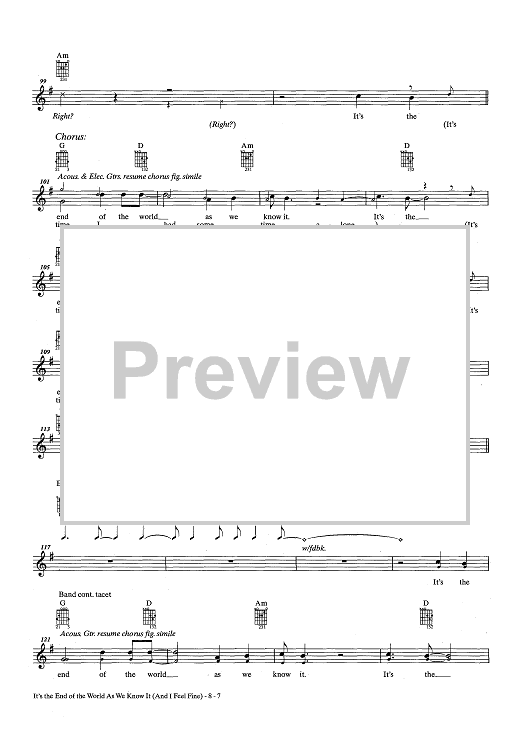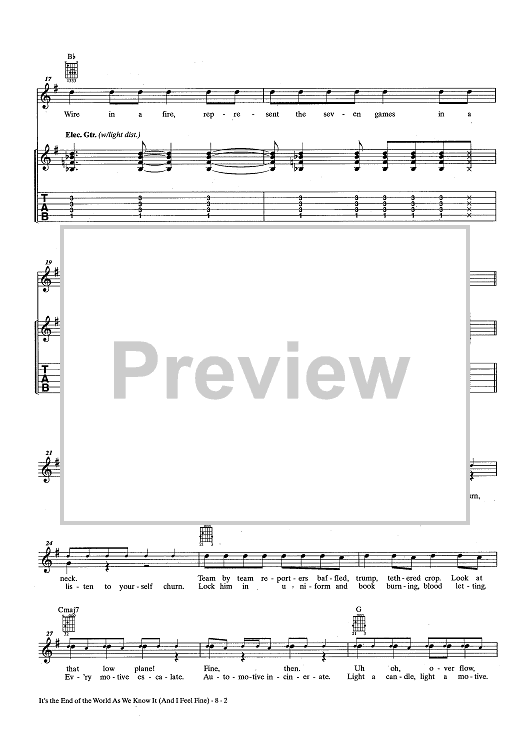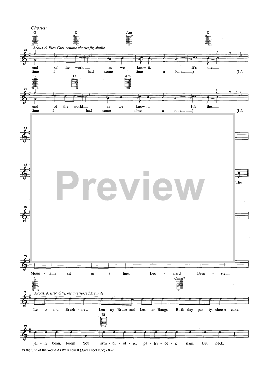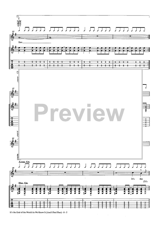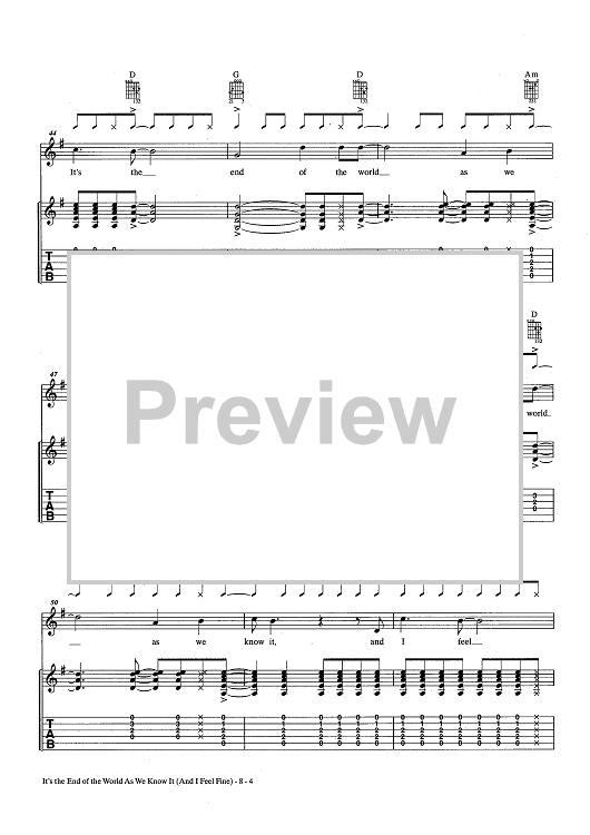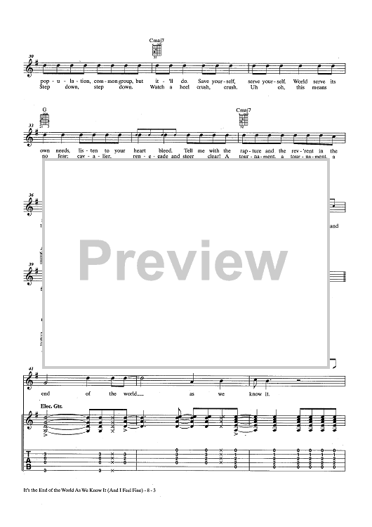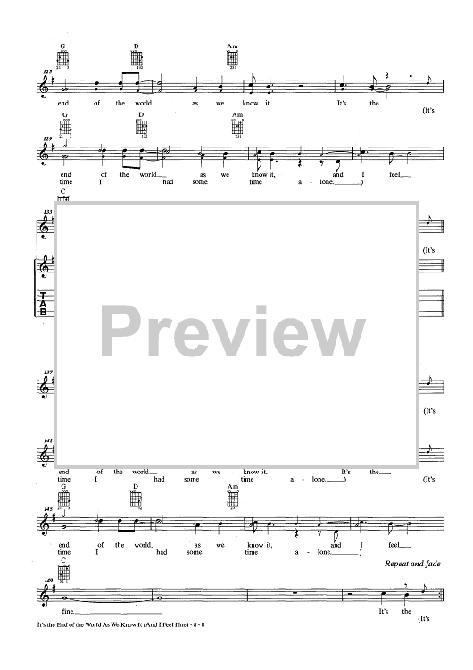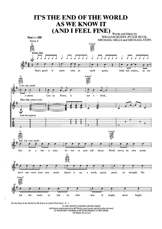 Digital Sheet Music for The End Of The World As We Know It (And I Feel Fine) by R.E.M., Michael Stipe, Peter Buck, Mike Mills, Bill Berry scored for Guitar Tab/Vocal/Chords; id:436777