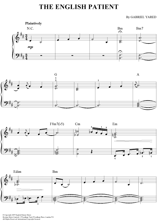 Digital Sheet Music for The English Patient by Gabriel Yared scored for Easy Piano/Chords; id:380794