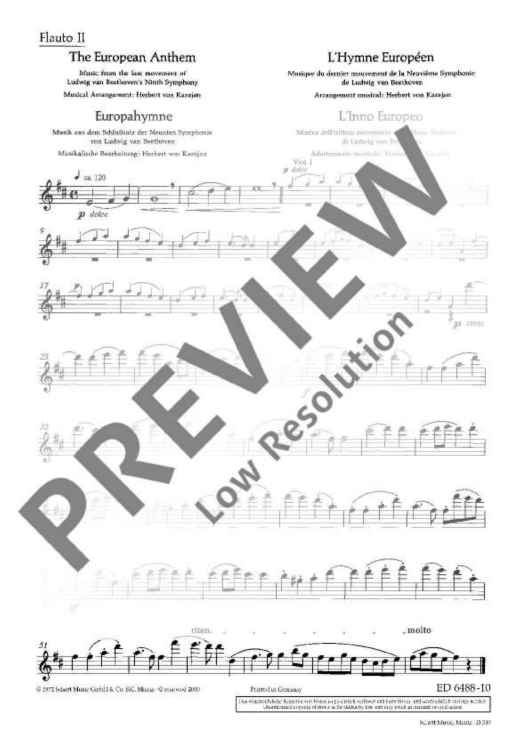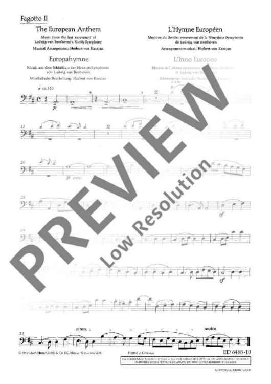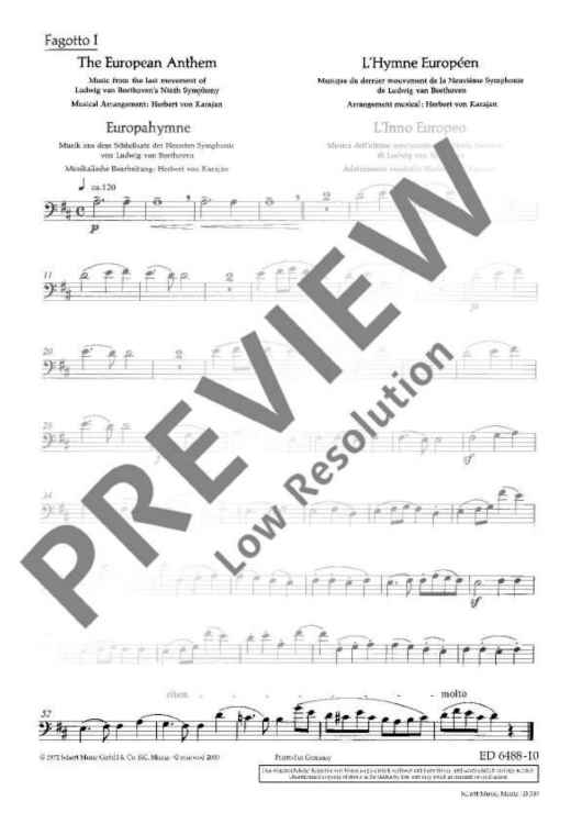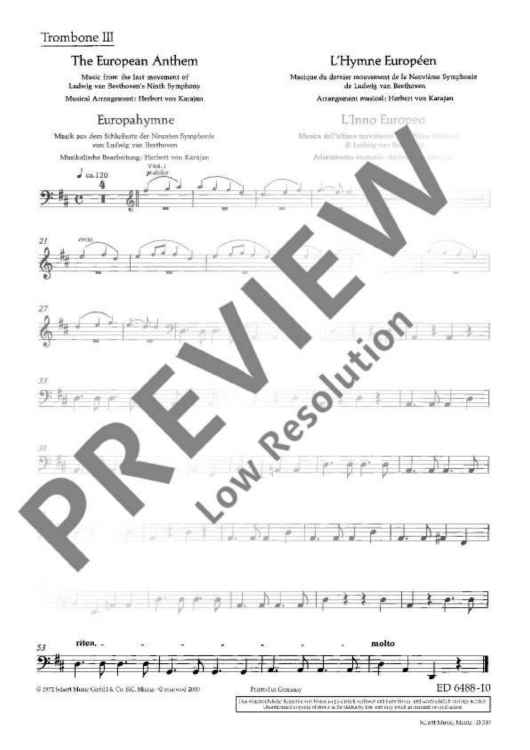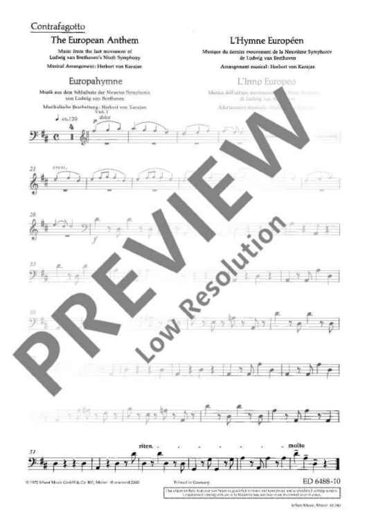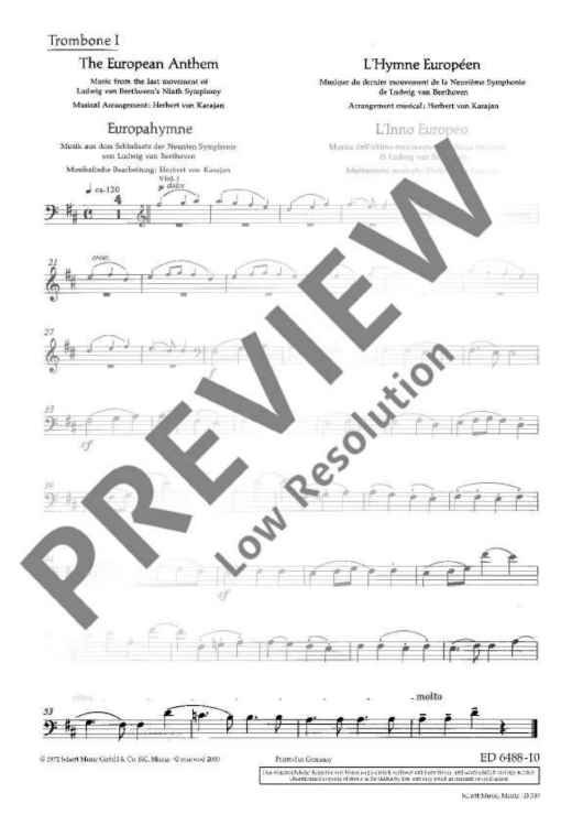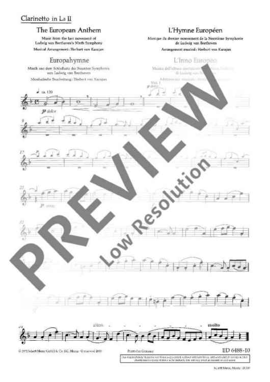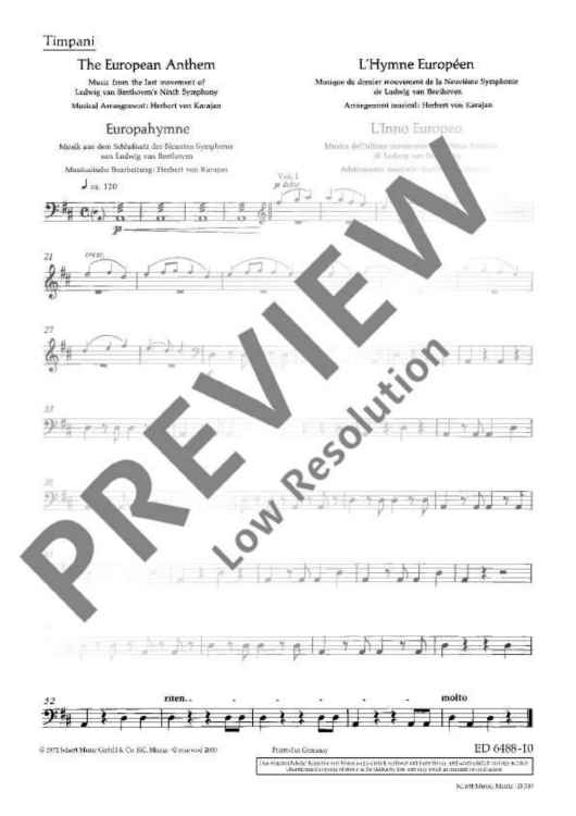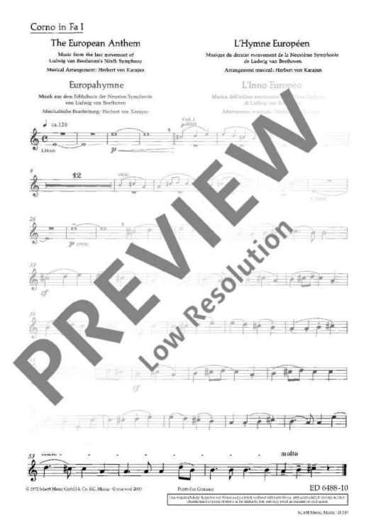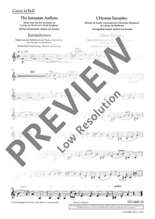 The European Hymn is the hymn not only of the European Union but of Europe in a broader sense. The melody has been taken from the Ninth Symphony by Ludwig van Beethoven from 1823. In the last movement of this symphony Beethoven set music to the 'Ode to Joy' by Friedrich von Schiller from 1785. This poem sprang from Schiller's idealistic vision of men who become brothers – a vision Beethoven shared with him. In 1972 the Council of Europe adopted Beethoven's 'Ode to Joy' as its anthem. The well-known conductor Herbert von Karajan was commissioned to arrange three instrumental versions – for solo piano, wind orchestra and symphony orchestra. Without words, in the universal language of music, the anthem is an expression of the idealistic values of freedom, peace and solidarity which Europe stands for. In 1985 the heads of state and government adopted the hymn as the EU's official anthem. It does not replace the national anthems of the member states, but rather celebrates common values as well as unity in diversity. The score of this offical anthem is exclusively available from the Schott publishing house.