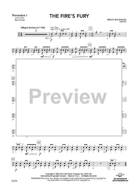 Digital Sheet Music for The Fire’s Fury - Percussion 1 by Brian Balmages scored for Concert Band; id:498806